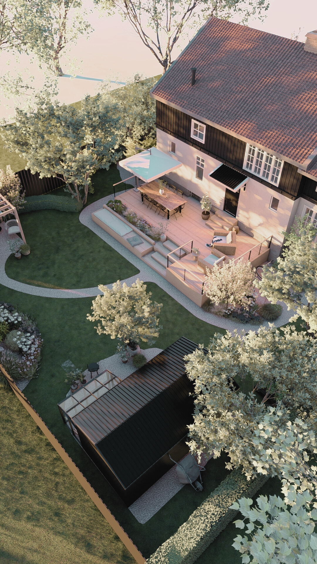 Ett första designförslag som visar struktur, form och känsla i din trädgård.